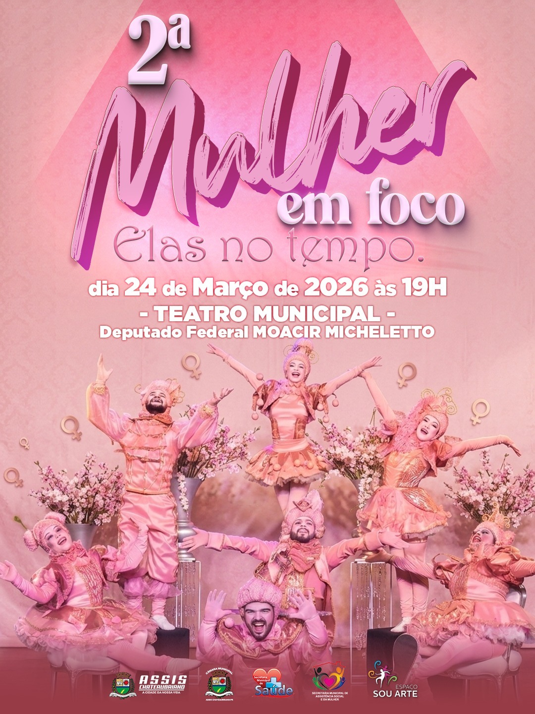 No próximo dia 24 de março, às 19h, o Teatro Municipal Deputado Federal Moacir Micheletto será palco da 2ª edição do evento “Mulher em Foco”, promovido pelo município de Assis Chateaubriand. Com o tema “Elas no Tempo”, a iniciativa é organizada pela Secretaria Municipal de Assistência Social e da Mulher, em parceria com a Secretaria Municipal de Saúde.
