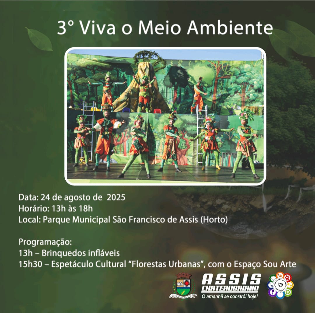 Será realizado no dia 24 de agosto (domingo), das 13h às 18h, no Parque Municipal São Francisco de Assis, o 3° Viva o Meio Ambiente. O evento, promovido pela Prefeitura de Assis Chateaubriand, por meio da Secretaria de Serviços Urbanos e Meio Ambiente, com apoio das demais secretarias municipais, pretende reunir toda a comunidade em atividades educativas e recreativas que destacam a importância da preservação ambiental e também faz parte das comemorações dos 59 anos do município de Assis Chateaubriand.