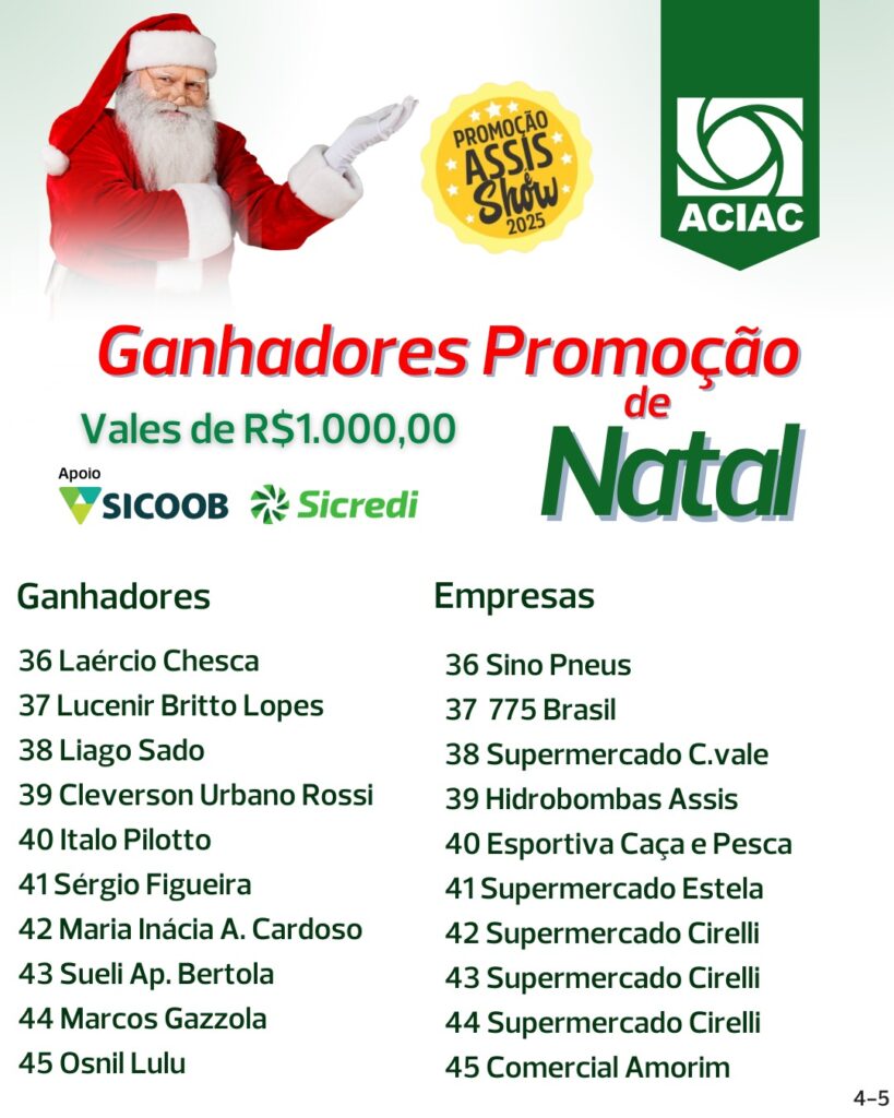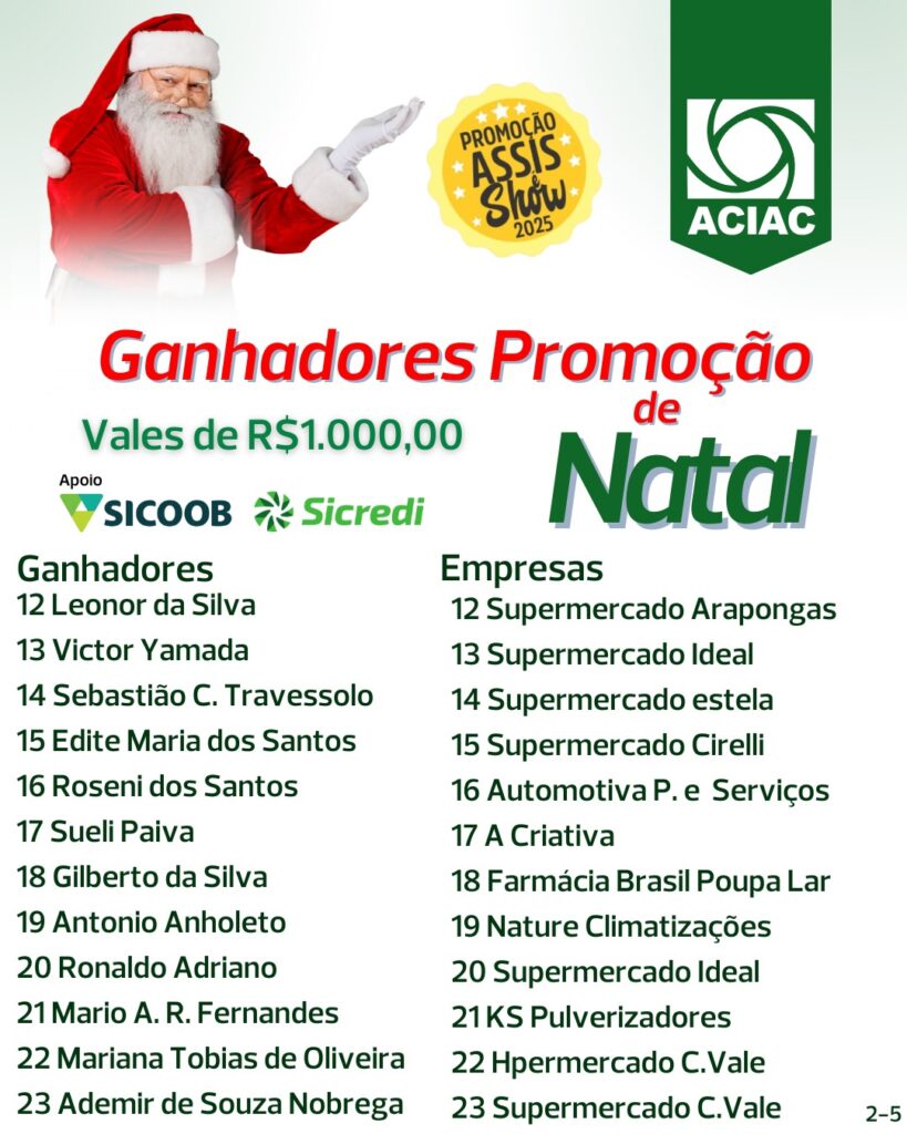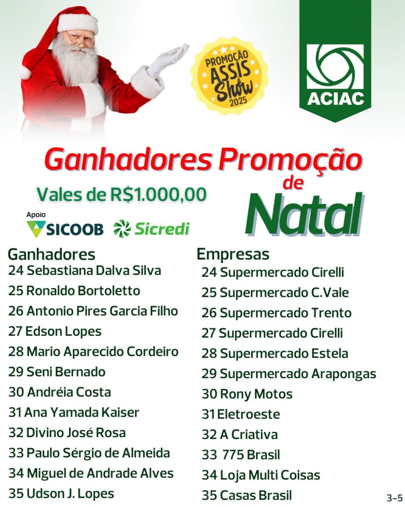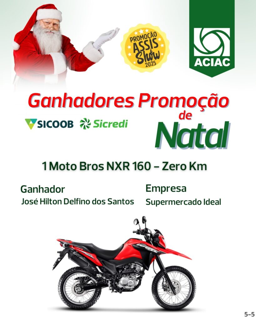 A Promoção Assis é Show/Natal 2025 contou com o patrocínio de Sicoob, Sicredi e Rony Motos, e mais uma vez cumpriu seu papel de incentivar as compras no comércio local, valorizar os empresários e premiar os consumidores que acreditam e investem em Assis Chateaubriand.