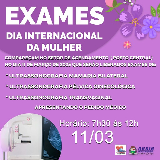 Em comemoração ao dia Internacional da Mulher, o município de Assis Chateaubriand, através da Secretaria de Saúde, realiza no sábado (11), a liberação de exames para mulheres com encaminhamento médico para Ultrassonografia Mamaria Bilateral, Ultrassonografia Pélvica Ginecológica e Ultrassonografia Transvaginal.