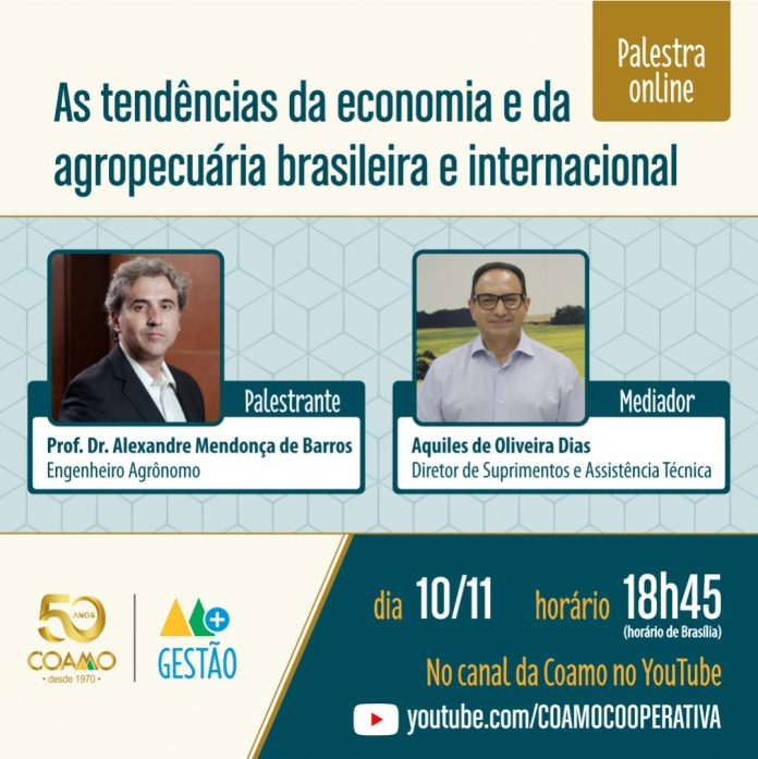 A palestra “Tendências da economia e da agropecuária brasileira e internacional”, organizada pela Coamo aos seus cooperados terá como palestrante o engenheiro agrônomo  Alexandre Mendonça de Barros, professor e doutor pela  Esalq/SUP, e como mediador o engenheiro agrônomo Aquiles de Oliveiras Dias, diretor de Suprimentos e Assistência Técnica da Coamo.