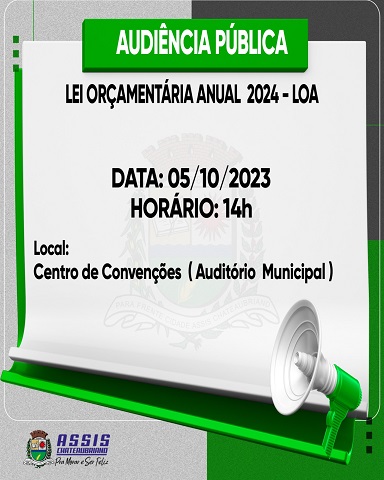 A Prefeitura de Assis Chateaubriand está convidando membros de conselhos, vereadores e todos os munícipes interessados a participarem da audiência pública referente à proposta da Lei Orçamentária Anual – LOA para o exercício de 2024, adequação do Plano Plurianual – PPA 2022 – 2025 e da Lei de Diretrizes Orçamentárias – LDO para o exercício de 2024. O evento acontecerá no Centro de Convenções (Auditório Municipal), às 14h, na quinta-feira (5) de outubro.