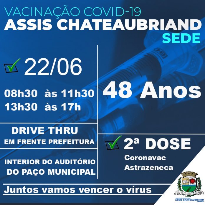 O município de Assis Chateaubriand, através da Secretaria de Saúde, irá avançar na vacinação contra o Covid-19 e nesta terça-feira (22) serão vacinadas as pessoas com 48 anos. Os trabalhos serão iniciados a partir das 08h30 até as 11h30 e das 13h30 às 17h. A orientação é para que todos possam levar cartão de vacina, CPF, documento com foto e comprovante de residência. A vacinação será em sistema drive-thru e no Auditório da prefeitura municipal, com as equipes trabalhando. Além das pessoas com 48 anos, as demais pessoas já chamadas anteriormente também podem procurar os pontos de vacinação se ainda não receberam a primeira dose, inclusive as com 49 anos chamadas nesta segunda-feira (21). Com relação à segunda dose, a vacinação segue. As pessoas devem verificar a carteirinha, observar a data e buscar a segunda dose do imunizante que é de extrema importância. Tanto para a segunda dose de Coronavac e AstraZeneca.