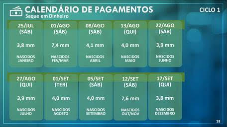 Os ciclos de crédito em conta e saques em espécie seguem até dezembro para o pagamento das cinco parcelas definidas pelo Governo Federal para o público do CadÚnico e para quem se cadastrou pelo App CAIXA | Auxílio Emergencial ou pelo site auxilio.caixa.gov.br.