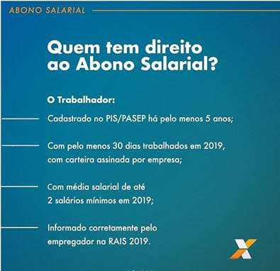 Tem direito ao Abono Salarial 2020/2021 o trabalhador inscrito no PIS há pelo menos cinco anos e que tenha trabalhado formalmente por pelo menos 30 dias em 2019, com remuneração mensal média de até dois salários mínimos. Também é necessário que os dados tenham sido informados corretamente pelo empregador na Relação Anual de Informações Sociais (RAIS) ou eSocial, conforme categoria da empresa.
