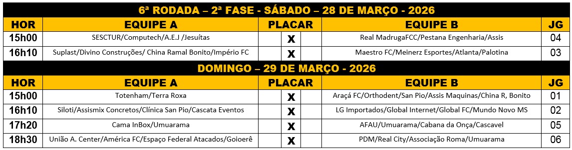 Quem terminou com a melhor campanha da primeira fase, foi o Império de Assis Chateaubriand. Jogando no sábado, os chateaubriandenses derrotaram o América de Goioerê por 1×0, fechando a fase com 4 vitórias e um saldo de 19 gols positivos. Na segunda fase que será realizada nos dias 28 e 29 de março, próximo fim de semana, duas equipes de Assis Chateaubriand jogam no sábado e outras duas jogam no domingo com expectativa de casa cheia.