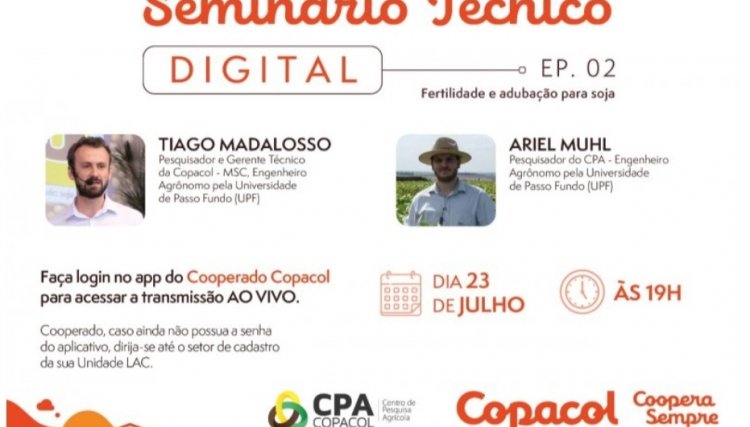 O próximo evento será o Seminário Técnico Digital, quinta-feira, dia 23 às 19h, na live transmitida pelo Youtube Oficial da Copacol. Durante o evento, o gerente técnico, engenheiro agrônomo, Tiago Madalosso, e o pesquisador do CPA (Centro de Pesquisa Agrícola), Ariel Muhl, abordarão fertilidade e adubação para a soja.