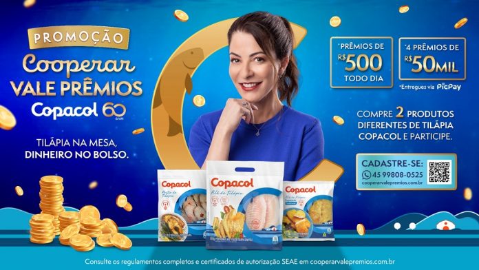 A Copacol vai sortear prêmios diários de R$ 500 e mais quatro prêmios de R$ 50 mil na Campanha de Quaresma Cooperar Vale Prêmios. A apresentadora do Programa Master Chef Brasil, Ana Paula Padrão, foi escolhida para divulgar a ação que coopera com “tilápia na mesa e dinheiro no bolso”.