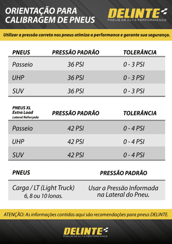 Confira o manual com a tabela completa de pressão recomendada para pneus Delinte: