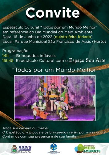 Segundo Douglas Cazaqui, Secretário de Obras, Serviços Urbanos, Infraestrutura e Meio Ambiente, “Toda a programação será mantida, iniciará às 14h com brinquedos infláveis para as crianças e às 15h45 com o belíssimo Espetáculo Cultural a ser realizado pelo Espaço Sou Arte com o tema “Todos por um Mundo Melhor”, contribuindo para a construção de valores sociais e atitudes voltadas para a conservação do Meio Ambiente.