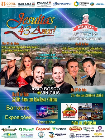 Após o grande show de João Bosco e Vinícius na noite de ontem, 6, segue neste domingo, 7, a festa dos 43 anos de Jesuítas com o 14º Leitão na Grelha, prato típico do Município, a partir das 11h30. Após, um mati-baile ao comando de Osvaldo Gaiteiro e Império Fandangueiro vai animar a tarde. Para fechar a noite e a festa com chave de ouro, a dupla Lourenço e Lourival vai encantar o público com os grandes sucessos da música sertaneja raiz. Na estrutura da festa a população de Jesuítas e região conta com parque de diversão, praça de alimentação, exposições de marcas e venda de produtos, além de outras atrações. Todo o lucro da festa será destinado às instituições do município, como a APAE, Associação Beneficente de Saúde de Jesuítas e Assistência Social.