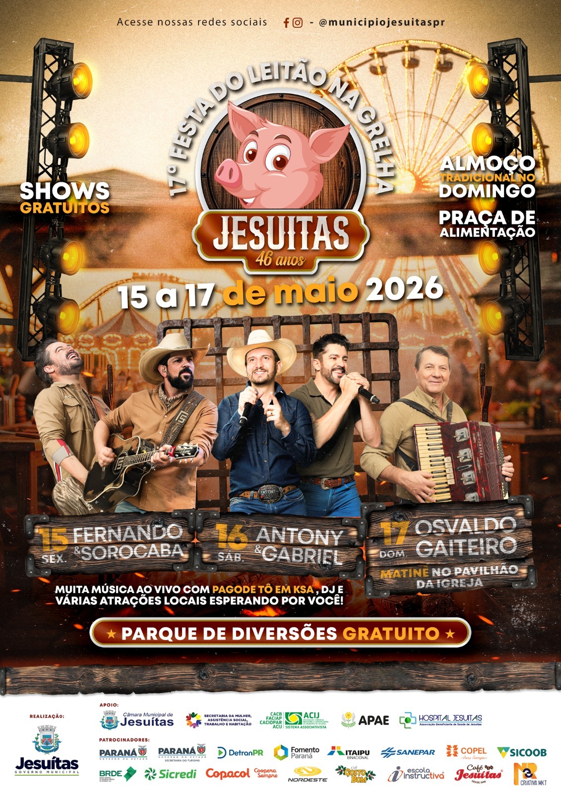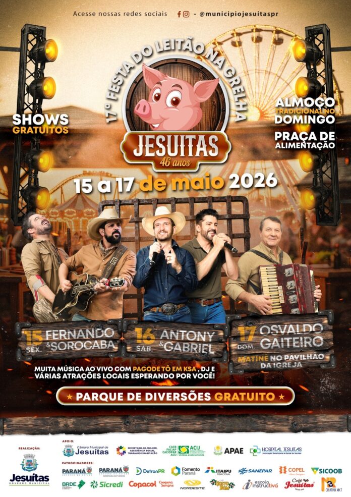 Jesuítas realizará a 17ª Festa do Leitão na Grelha, para comemorar os 46 anos de emancipação. O evento será realizado entre os dias 15 e 17 de maio de 2026, com programação diversificada, pensada para toda a família, reunindo gastronomia, cultura e grandes atrações musicais.