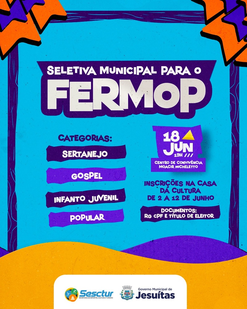 O município de Jesuítas vai realizar no dia 18 de junho, às 19h, a Seletiva Municipal para o Fermop 2025 (Festival Regional dos Municípios do Oeste do Paraná). O evento acontecerá no Centro de Convivência Moacir Micheletto e reunirá talentos locais em quatro categorias: Sertaneja, Gospel, Infantojuvenil e Popular.