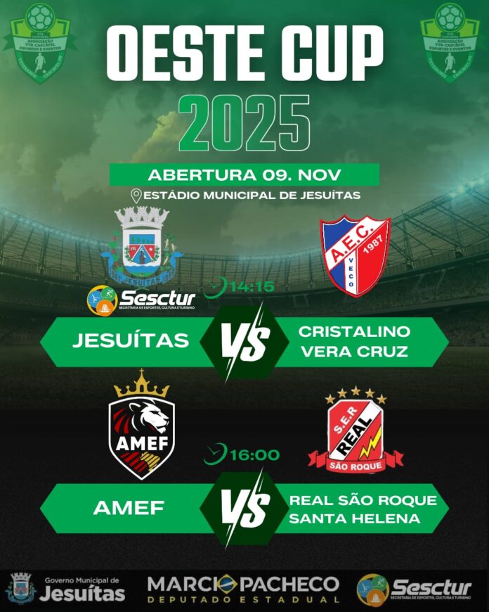 O esporte amador promete fortes emoções neste fim de semana em Jesuítas. A cidade será sede da abertura oficial da Oeste Cup 2025, que acontece neste domingo, dia 9 de novembro, a partir das 14h, no Estádio Municipal Zicão.