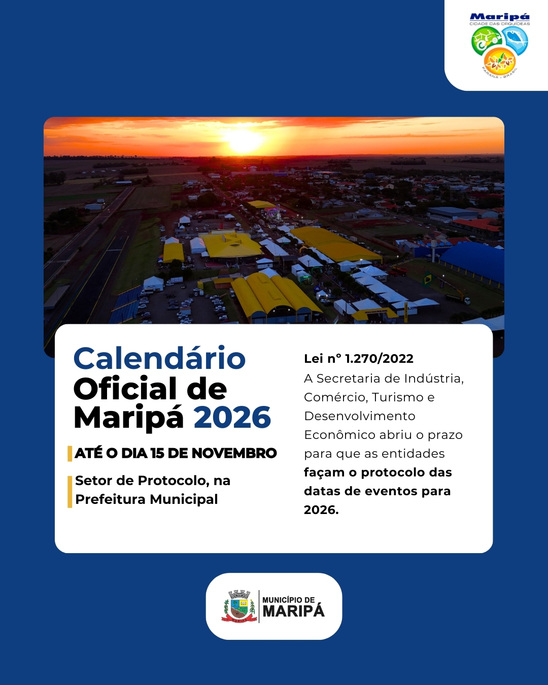 A ação segue o que determina a Lei Municipal nº 1.270/2022, que instituiu o Calendário Oficial de Eventos de Maripá. O objetivo é garantir organização, visibilidade e apoio institucional às atividades de interesse público que contribuem para o desenvolvimento cultural, esportivo, turístico e econômico do município.
