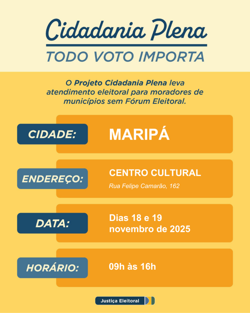 O município de Maripá vai receber nos dias 18 e 19 de novembro de 2025 o projeto Cidadania Plena – Todo Voto Importa, promovido pelo Tribunal Regional Eleitoral do Paraná (TRE-PR), por meio da 124ª Zona Eleitoral de Palotina. O atendimento será realizado no Centro Cultural, localizado na Rua Felipe Camarão, 162, das 9h às 16h.