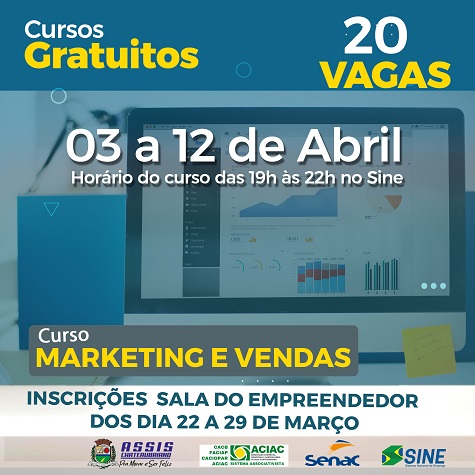 Serão abertas nesta quarta-feira (22), as inscrições para o curso de Marketing e Vendas que será realizado pelo município de Assis Chateaubriand, através da Secretaria de Trabalho, Emprego e Turismo. Os interessados devem efetivar a inscrição na Sala do Empreendedor.