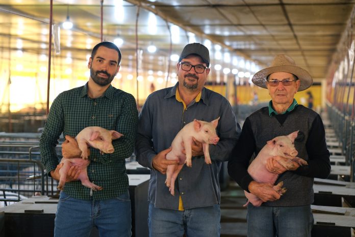 Em uma propriedade de 12 hectares no interior de Palotina (PR), três gerações da família Benincá produzem mais do que soja, milho e suínos. Cultiva-se um legado de trabalho, valores e evolução. João, o avô, de 85 anos, estabeleceu as primeiras raízes, o filho Leonir cultivou a planta e o neto Eduardo projeta o futuro com olhos atentos à tecnologia. “Minha infância foi no sítio, brincando dentro do caixote de ração que o vô usava”, recorda Eduardo Benincá, de 32 anos, que, há cerca de cinco anos, trocou o escritório de arquitetura pelo manejo dos leitões e pelo monitoramento digital da granja. A decisão nasceu de uma urgência familiar, durante a pandemia da Covid-19, mas floresceu como uma escolha de vida. “Eu sempre estive por perto, mas foi nesse momento que entendi que meu lugar também era aqui.”