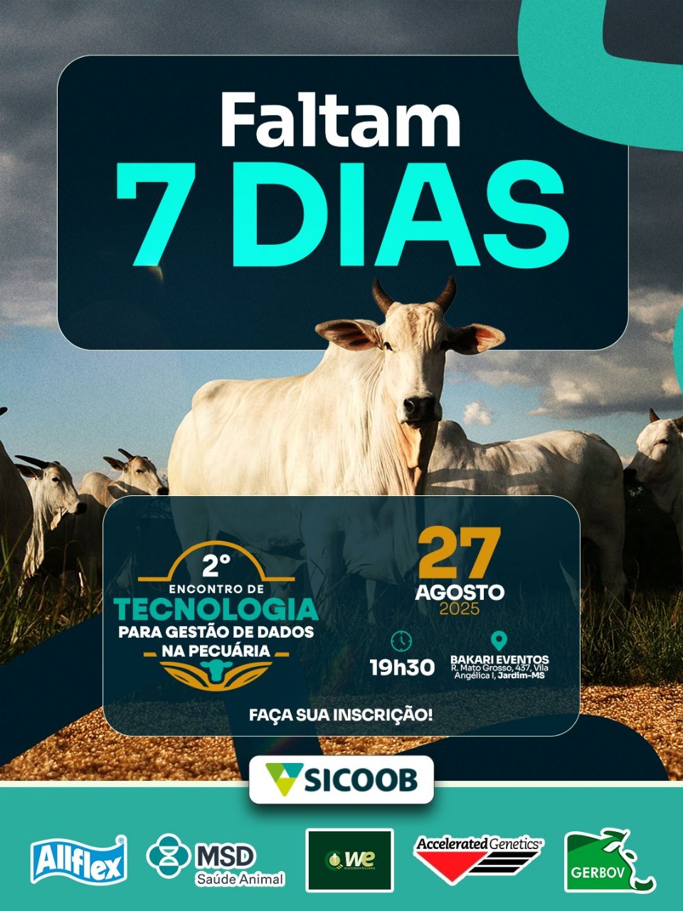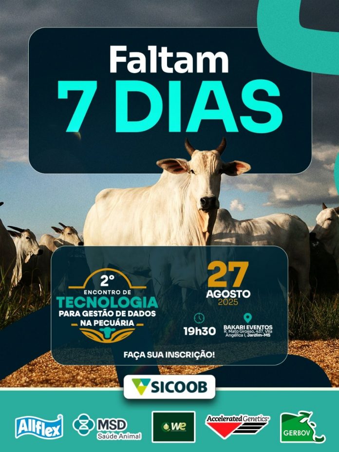 Sucesso no ano passado em Jardim/MS, o II Encontro de Tecnologia para Gestão na Pecuária está confirmado! Em parceria com o Sicoob Médio Oeste, Alflex/MSD Saúde Animal, WE Assessoria Pecuária/Accelerated Genetics e Gerbov, o evento acontecerá na quarta-feira, 27 de agosto de 2025, às 19h30, no Bakari Eventos (Rua Mato Grosso, 437, Bairro Vila Angélica I).