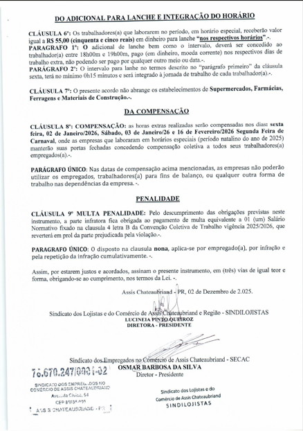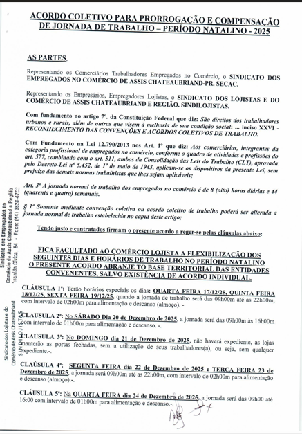 “Estamos muito satisfeitos em ter alcançado esse acordo que atende às necessidades do comércio e dos trabalhadores. A flexibilidade nos horários permitirá que os lojistas atendam à demanda do período natalino. Agradeço a colaboração de todos os envolvidos e espero que esse acordo traga benefícios para todos. É um momento importante para o comércio de Assis Chateaubriand.” – Lucineia Pinto Queiroz, presidente do Sindilojistas.