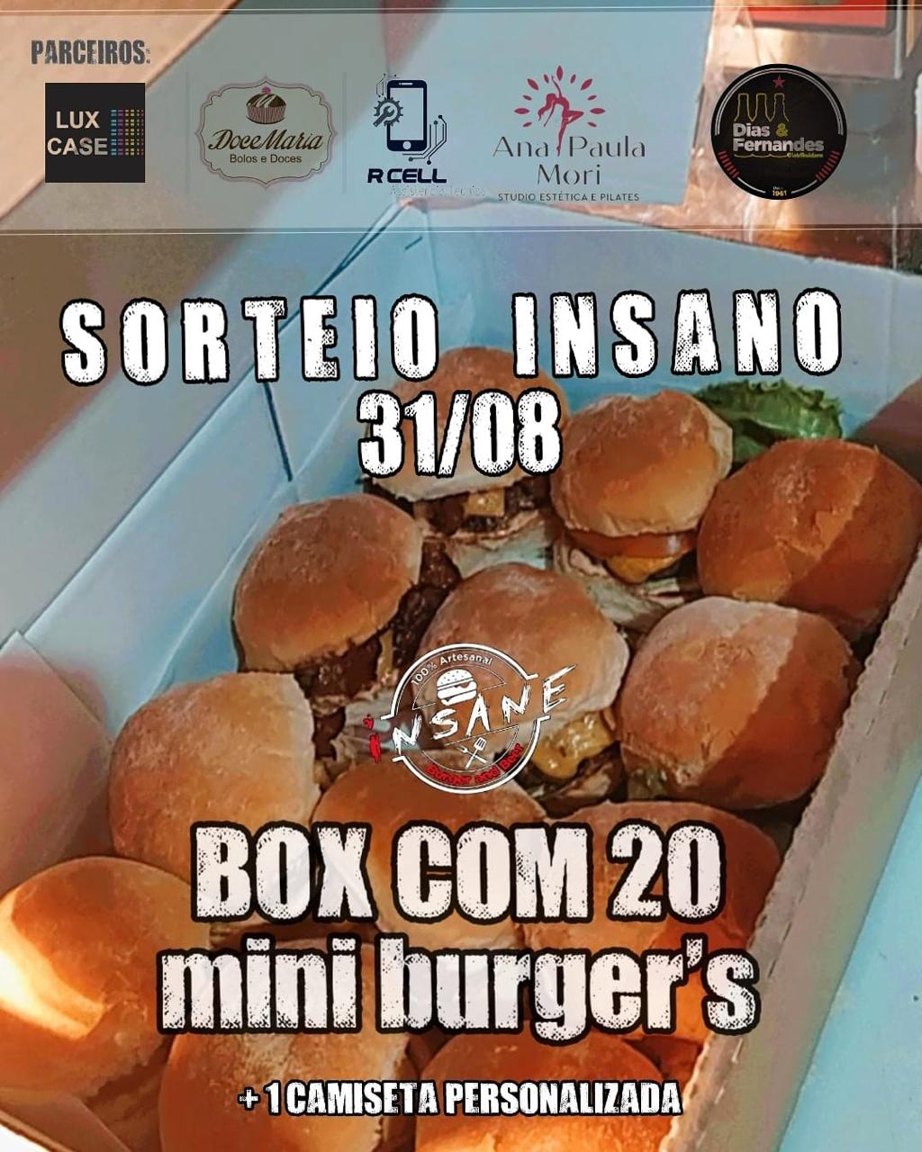 O ‘Insane Burger and Beer’ vai sortear no dia 31 de agosto um verdadeiro ‘COMBO’. Além de uma box com 20 mini-burgers e uma camiseta personalizada, terão + 5 prêmios insanos. Quer saber mais sobre o sorteio?