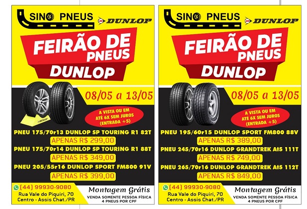 Começa nesta segunda-feira, 8, e segue até dia 13 de maio o Feirão de Pneus Dunlop na Sino Pneus. Pagamento à vista em até seis vezes sem juros ( entrada mais cinco), com montagem grátis. Vá conferir na Sino Pneus, Rua Vale do Piquiri, 70, em Assis Chateaubriand. Atenção: venda só para ‘pessoa física’ e limite de quatro pneus por CPF.